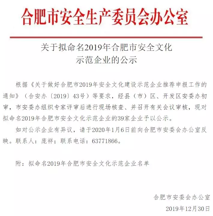 關(guān)于擬命名2019年合肥市安全文化示范企業(yè)的公示